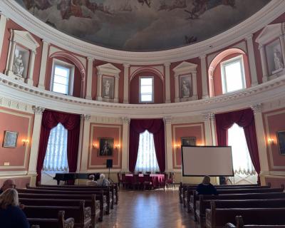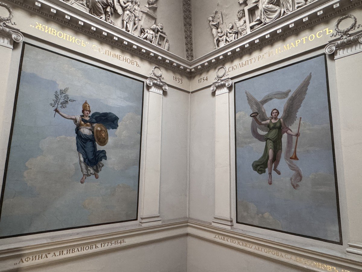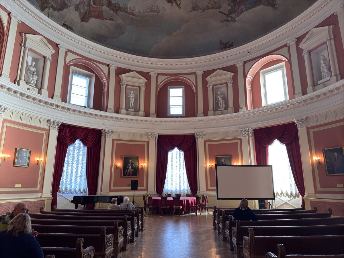 Мы начнём с парадного пространства Академии — зала, где на протяжении столетий проходили защиты дипломов. Вы увидите подлинный интерьер 18 века, который отражает атмосферу академической среды.