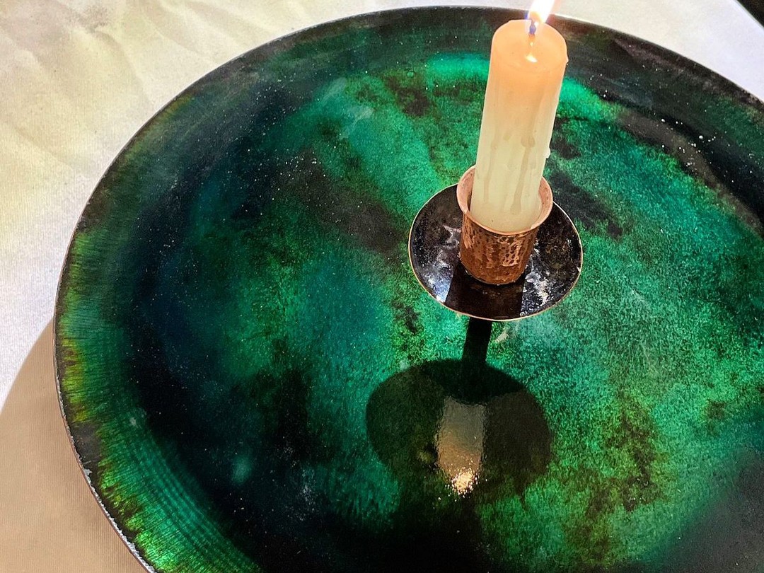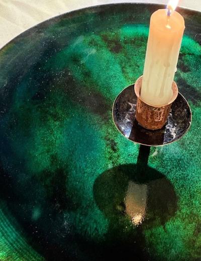 Сделаете подсвечник, блюдце, подвеску, брошь, кольцо, серьги или кулон. Мы предложим разные заготовки, вырезанные из меди, — и вы покроете из эмалью на свой вкус. А потом мы отнесём изделия на обжиг и охлаждение. И в этот же день вы заберёте шедевр домой.