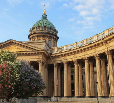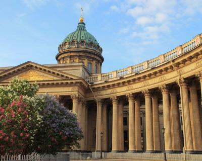 Казанский собор. На его возведение ушло всего десять лет. Это настоящий рекорд скорости строительства такого объёма для начала 19 века. Что ему способствовало — узнаете на экскурсии.