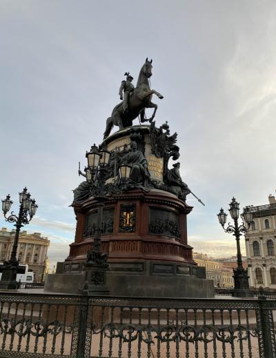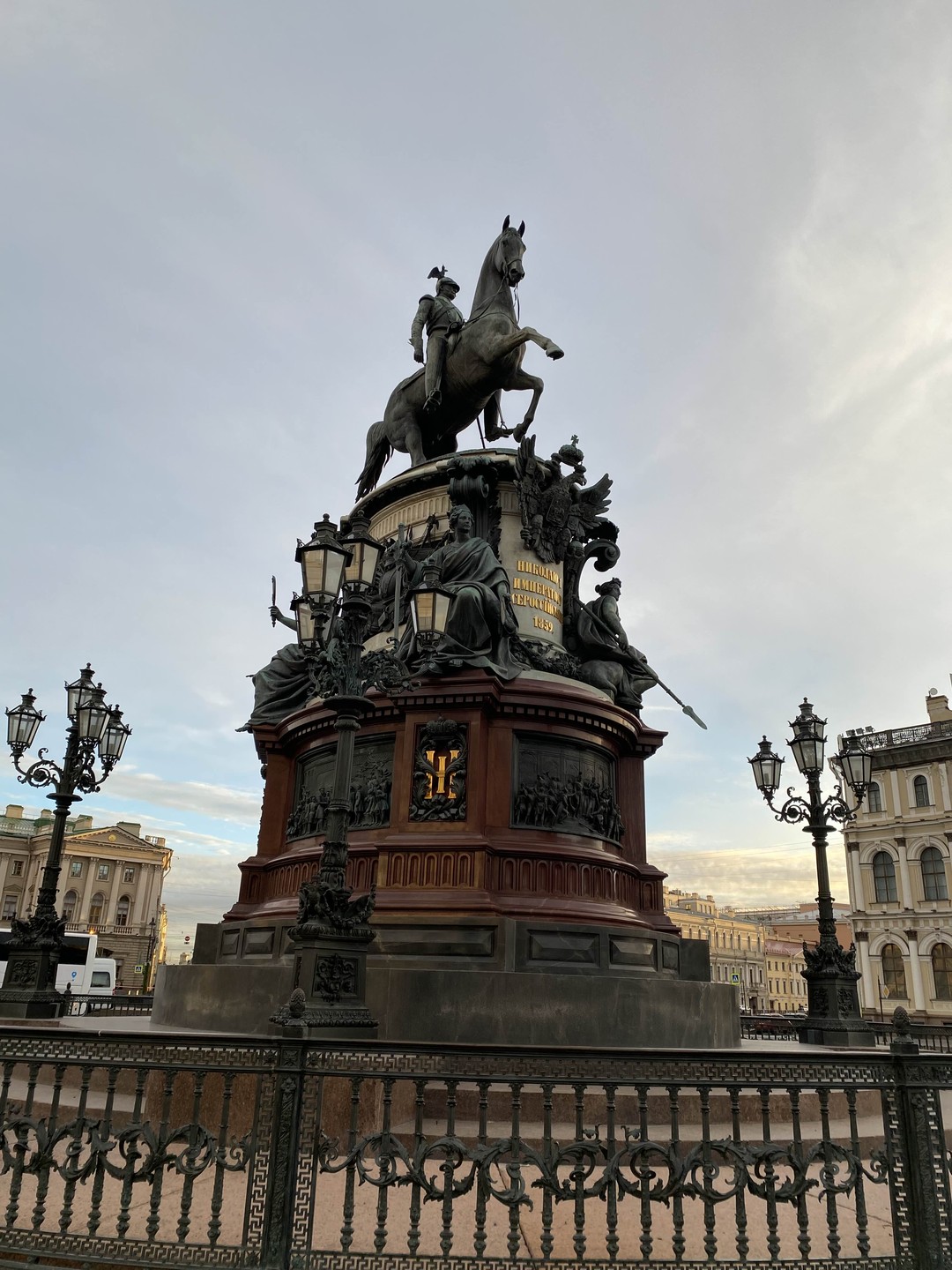 А завершим наше небольшое путешествие на Исакиевской площади — перед величественным фасадом Исаакиевского собора, напротив конной статуи императору Николаю I. И поговорим о том, почему он вечно обречён мчаться вслед Петру I.