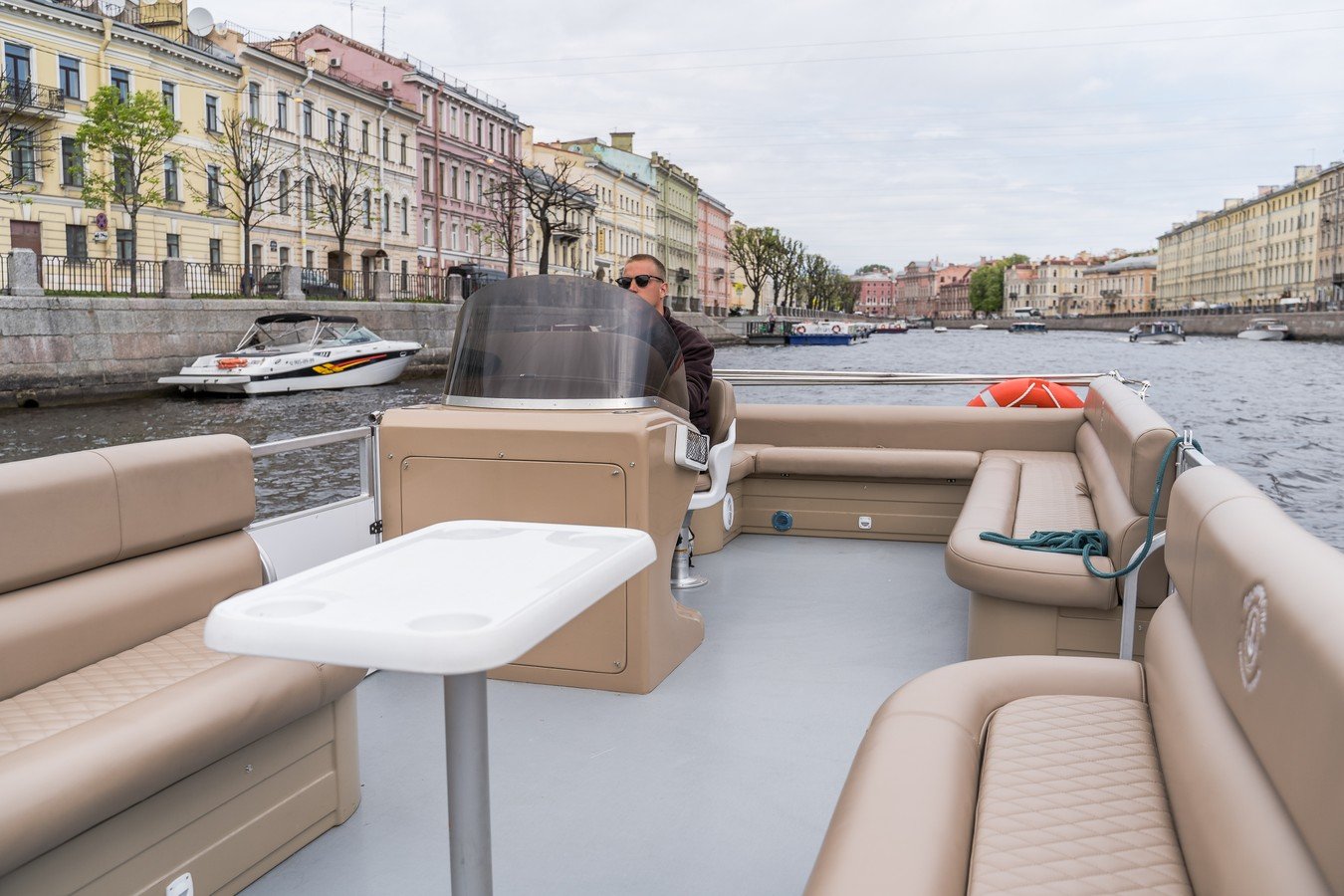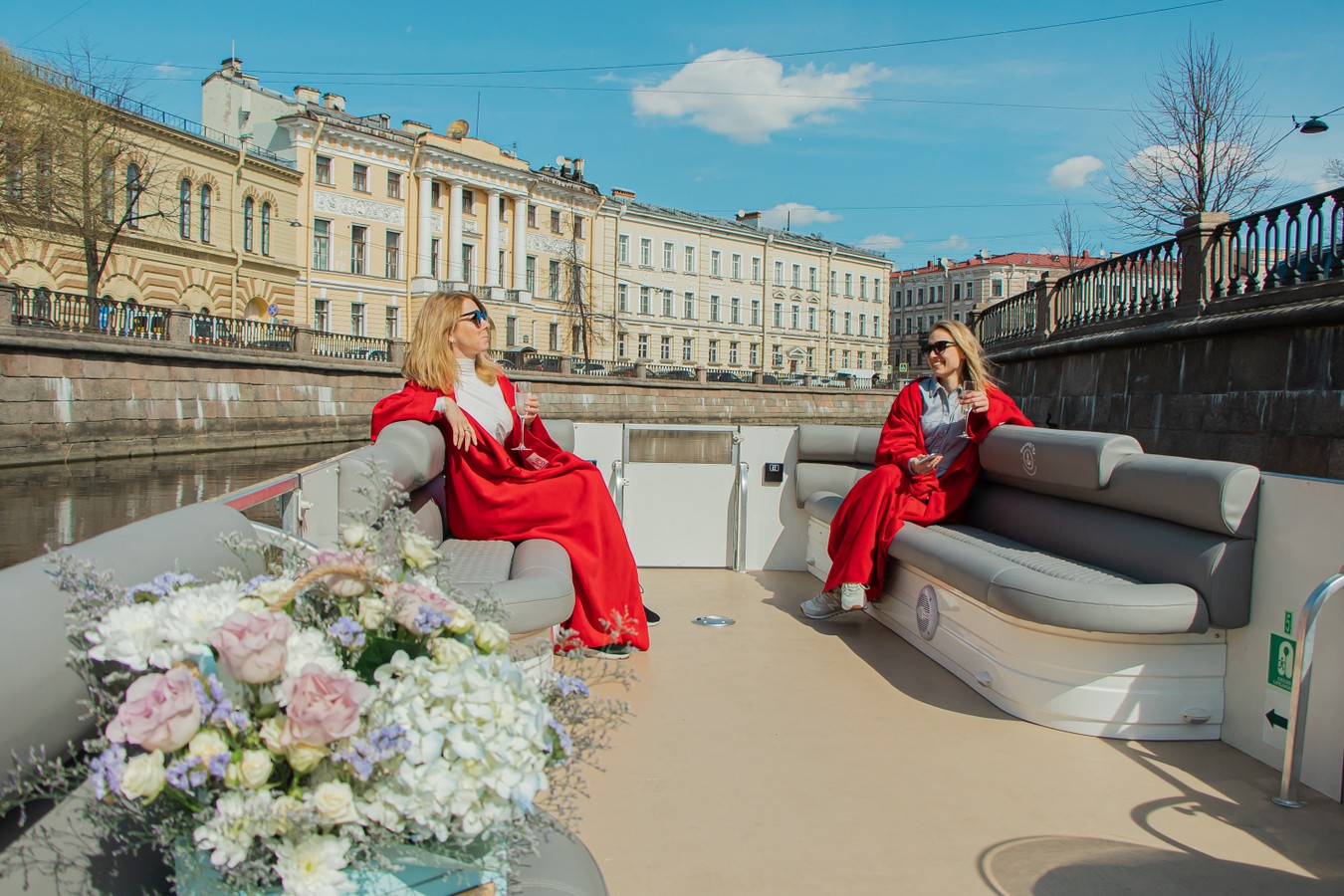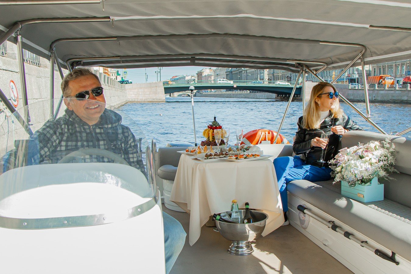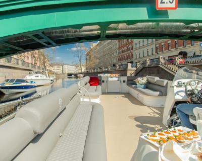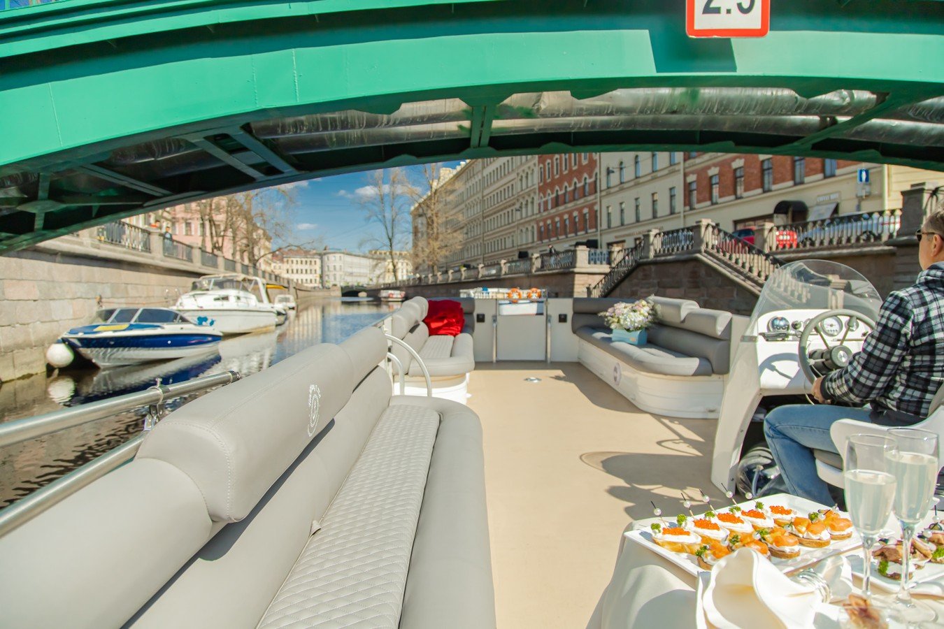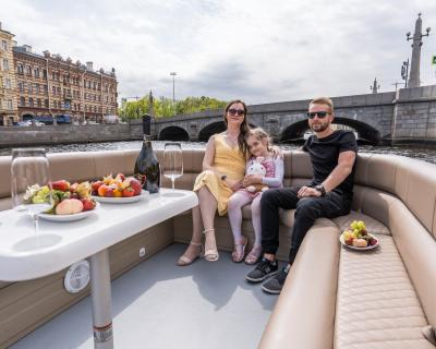 Прогулка на моторном катере. Этот формат предназначен для семьи или компании друзей. На катере есть все необходимое: столик, удобные мягкие диваны, расположенные по всему периметру судна, пледы, а также тент на случай дождя или яркого солнца. Катер полностью открытый, поэтому ничто не помещает вам рассмотреть красоты города.