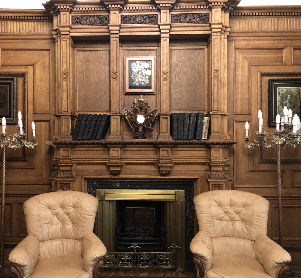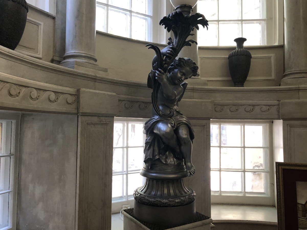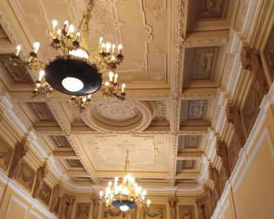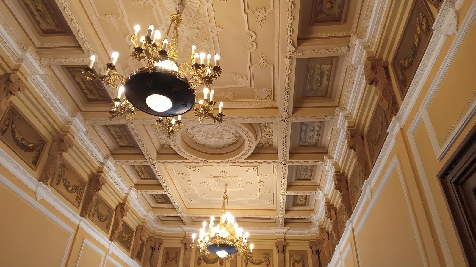 - а также восстановленную лепнину, росписи потолков, резную отделку дверей и камины 19 века