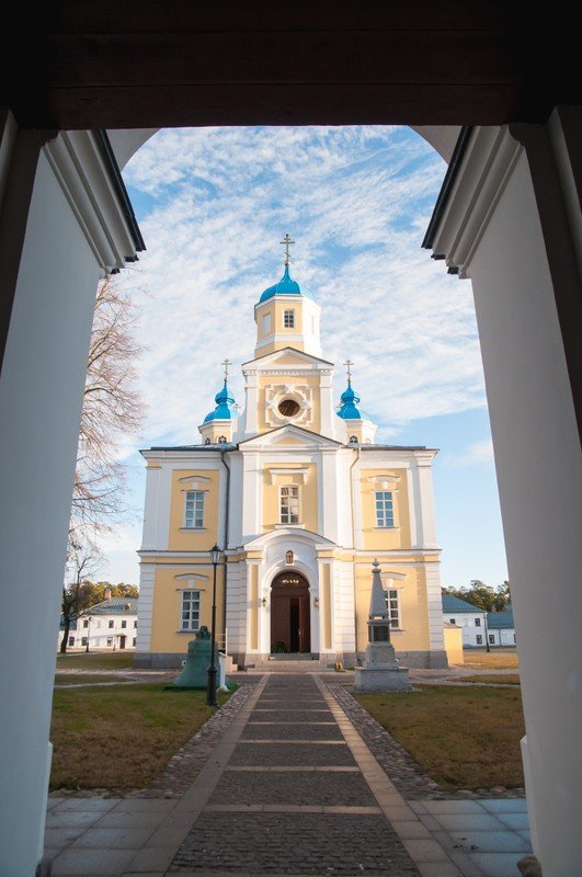 - И вот перед вами центральное здание — Собор Рождества Пресвятой Богородицы. Здесь хранятся мощи Преподобного Арсения Коневского и чудотворная икона Коневской Божией Матери.