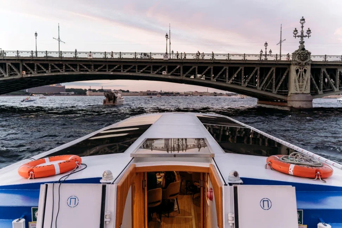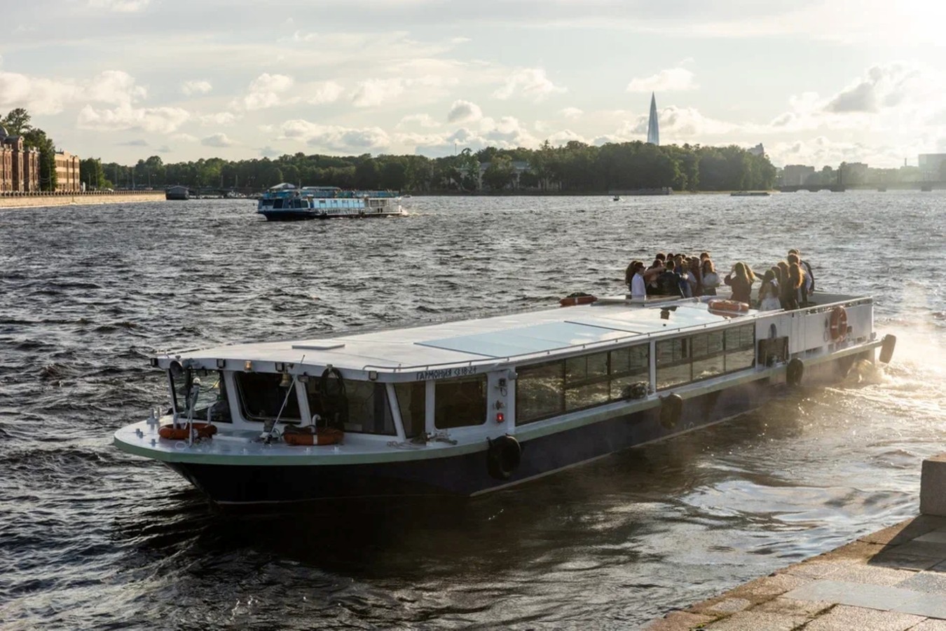 - Прогулка проходит на однопалубном теплоходе: открытая палуба и панорамный салон. На борту — все необходимые средства безопасности