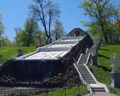 Переходим в Нижний парк. Начнём с его западной части. Условно, это женская половина, что отмечено фонтаном «Ева» и дворцом Марли, задуманным как гостевой домик. По пути к нему встретим каскады «Львиный» и «Золотая гора». Поднимемся на искусственную насыпь и увидим то, к чему стремился Пётр I, — Балтийское море. В ясную погоду будут видны и Петербург с Кронштадтом.