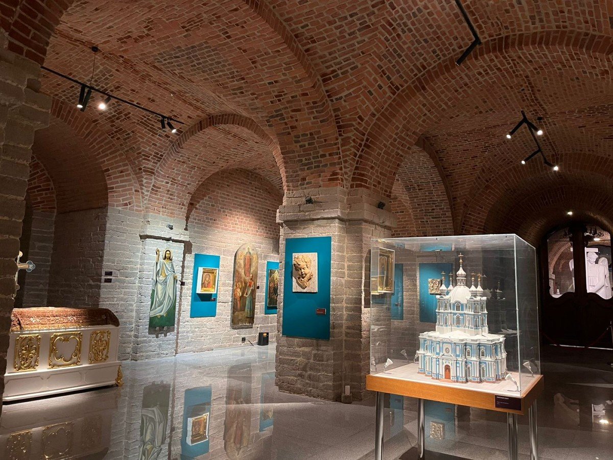 Вы посетите подцерковье Смольного собора — атмосферное пространство со стенами из красного кирпича, где сейчас гостит выставка.