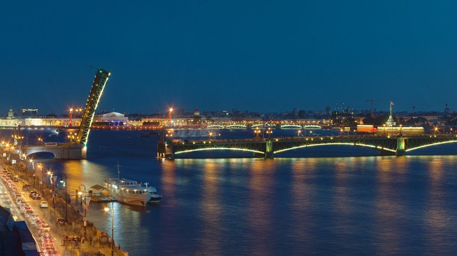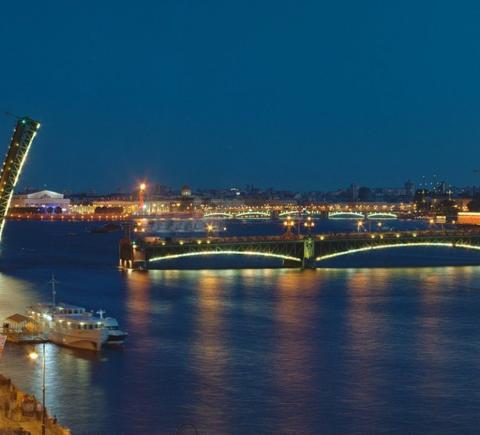 Пятый мост — самый длинный (около километра) и интересно подсвеченный. Увидим его разводку из точки, где безлюдно даже в разгар летнего сезона.