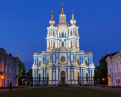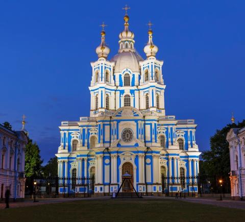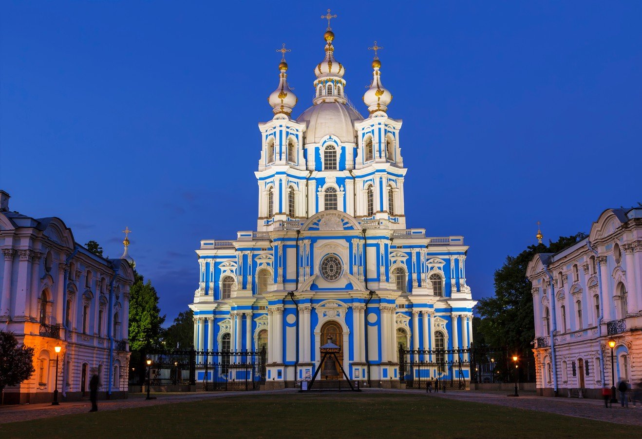 - Смольный собор. Вы узнаете, в каком архитектурном стиле он построен, как вписался в единый ансамбль Смольного монастыря и что на этом месте было раньше. Услышите, за что Екатерина II называла его «взбитые сливки». А также разгадаете фокус в исполнении гида: он покажет вам, как собор «врастает в землю»