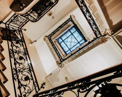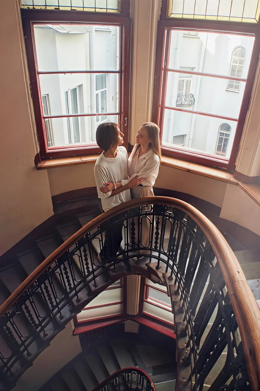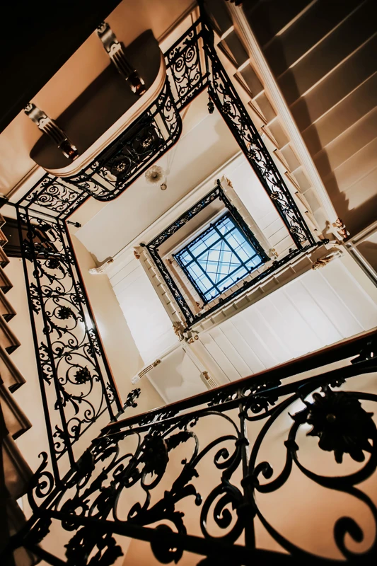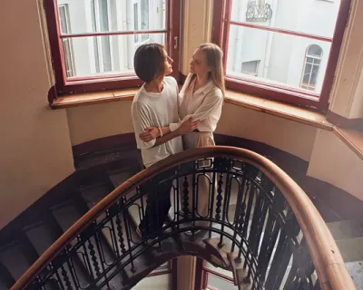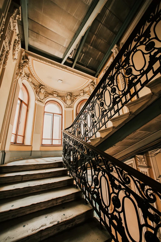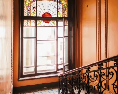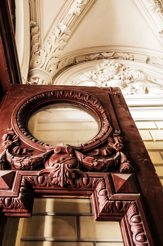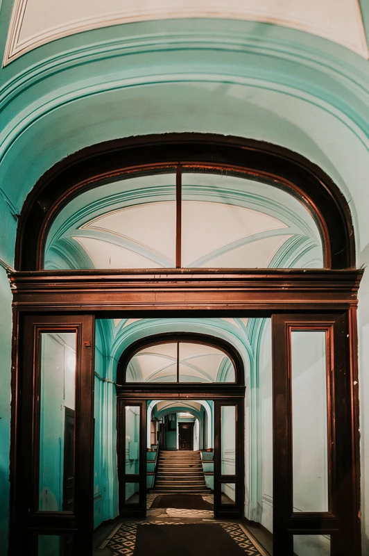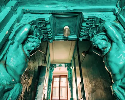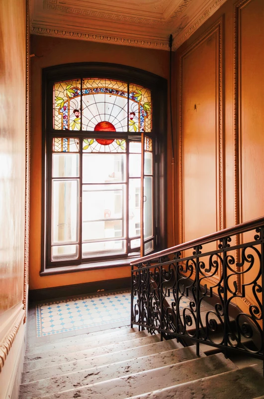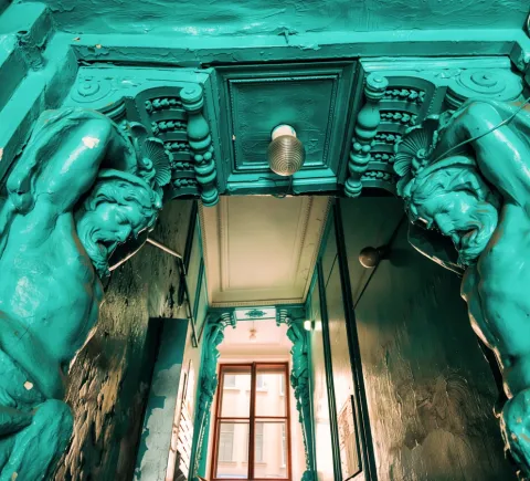 - Парадные с кариатидами и витражами. Поднимемся по лестницам, где до сих пор звенят дверные колокольчики и горят старинные фонари. В одной — голубые стены и позолота, в другой — кариатиды и купидоны