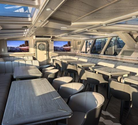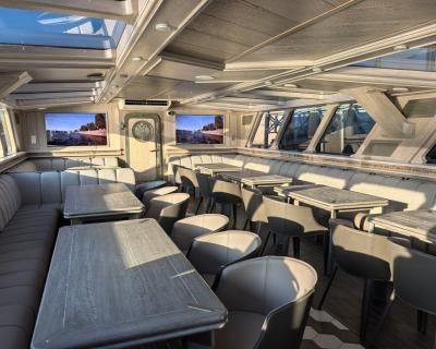 - Есть две палубы: закрытая отапливаемая и открытая, с панорамным видом. Есть гальюн (туалет)