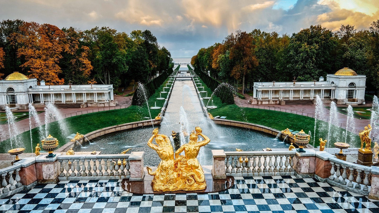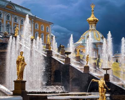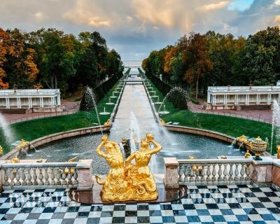 Жемчужины русского Версаля. Вы спуститесь по лестнице вдоль Большого каскада и увидите знаменитые фонтаны: «Самсона» и «Фаворитку», «Шахматную гору» и «Римские фонтаны», «Солнце» и «Раковину», «Адама и Еву», «Пирамиду», «Золотую гору» и другие.