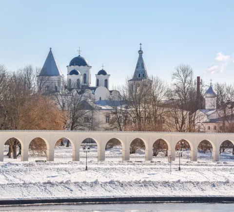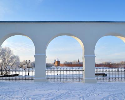 Исторический центр новгородского Торга, купеческие церкви и аркада Гостиного двора.