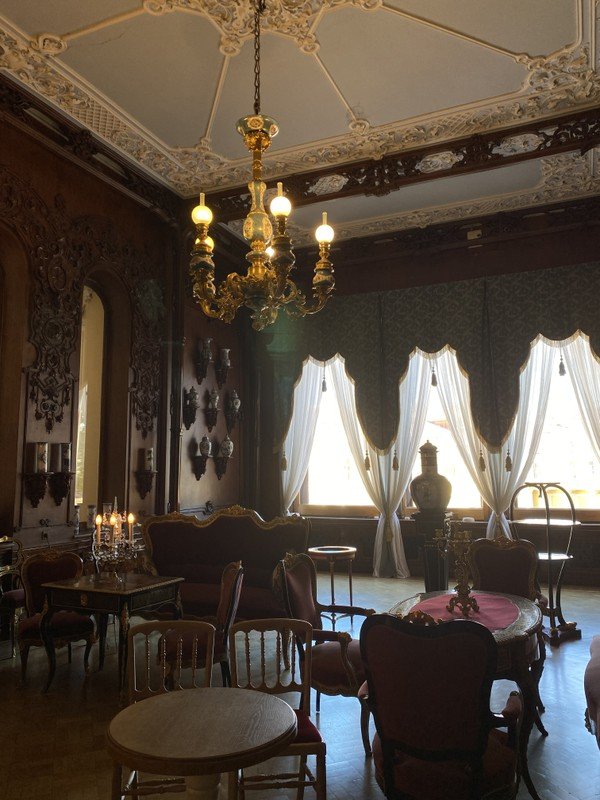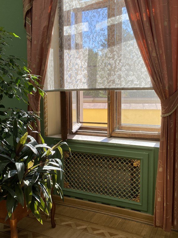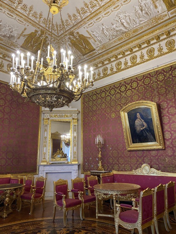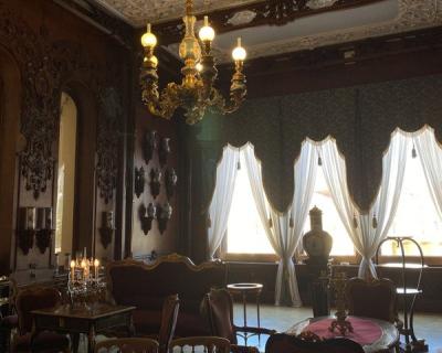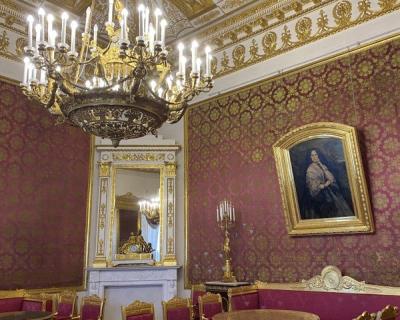 - Красная гостиная — роскошный зал в насыщенных тонах, хранящий воспоминания о великосветских собраниях