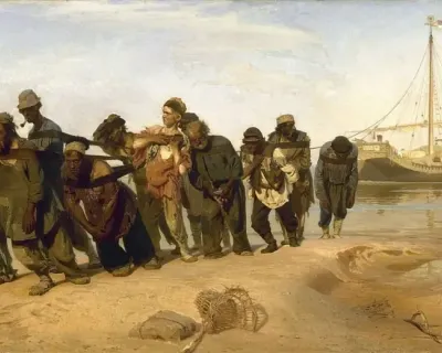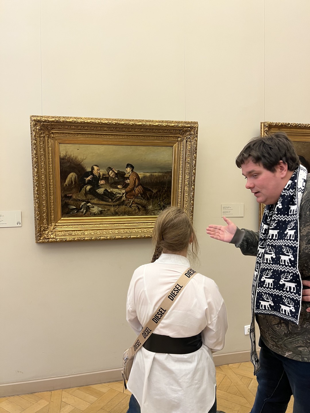 - Нескучная история России. Мы узнаем про жизнь Петра Великого, рассматривая скульптуру императора с сердечками вместо глаз. «Бурлаки» напомнят нам супергероев прошлого. А еще постараемся отыскать знакомые места на старинных картинах (к примеру, Дворцовую площадь).