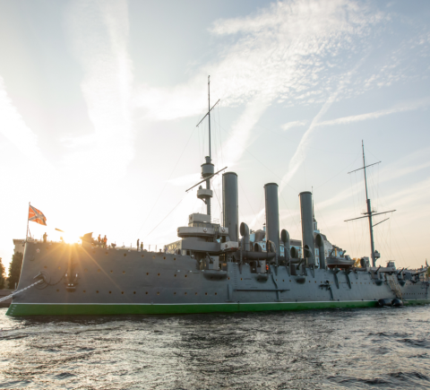 Крейсер «Аврора» с нового ракурса. В Большой Невке теплоход пройдёт у борта легендарного судна. Отсюда вы оцените его масштаб и сможете сделать кадры, недоступные с берега.